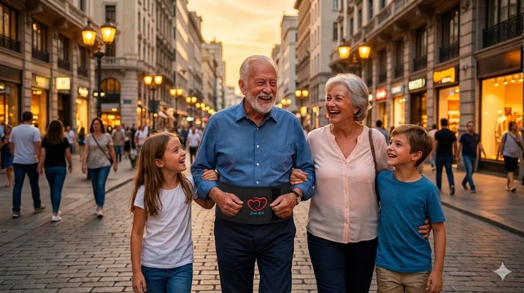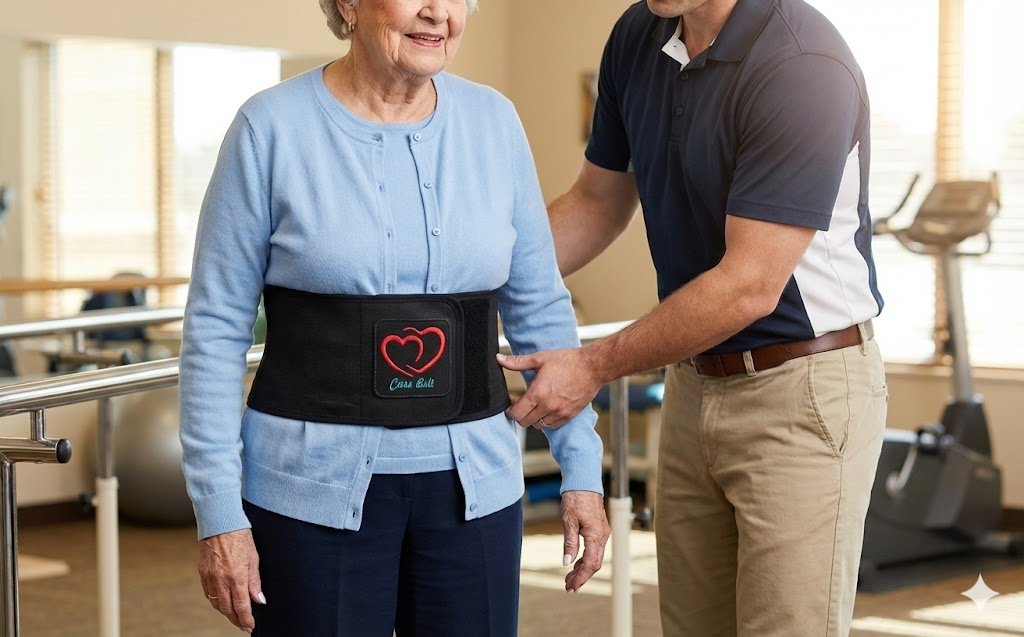 A wide, soft mobility belt with proprietary directional stretch—comfortable around the torso, yet firm vertically for secure support. No stiff or sharp components.